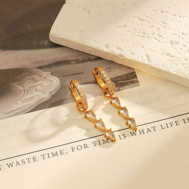 18k Gold Plated Waterproof Wholesale Custom Engraving Fringe with Diamonds Water Drop Stainless Steel Fashion Earrings for Women