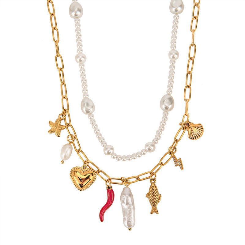 Ocean Style Stainless Steel Pearl Necklace Double Layered and Geometrically Simple Women's Heart-shaped Necklace