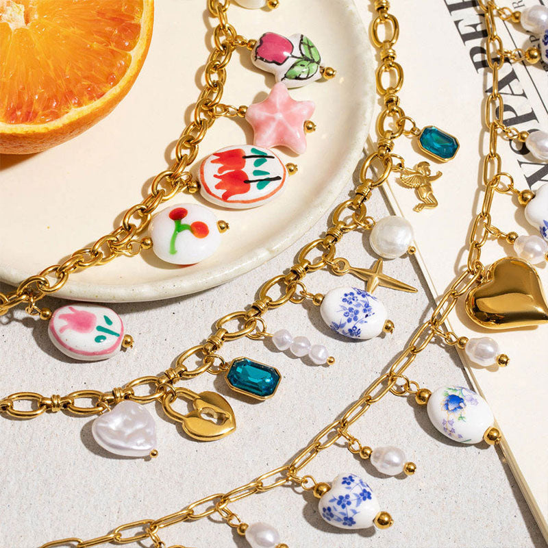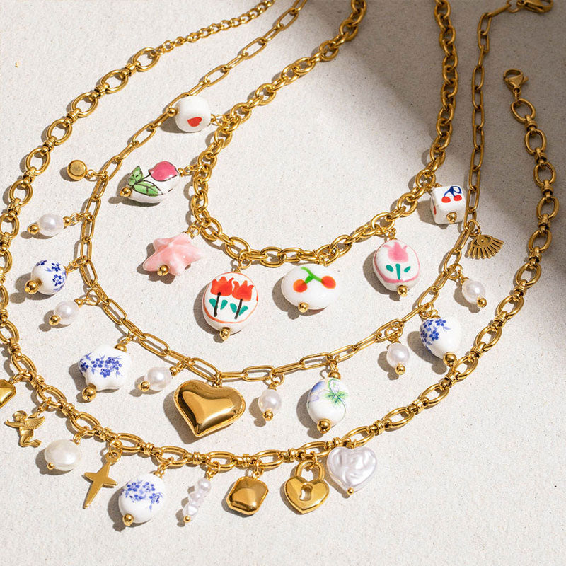 Trendy Anti Tarnish Gold Necklace 18k Real Stainless Steel Ceramic Heart Zircon Pearl Pendant Necklace for Women Girls