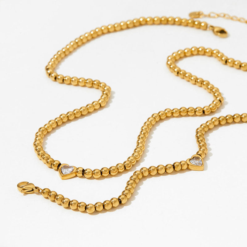 Women's Romantic Fashion Jewelry Waterproof Real Gold Plated Stainless Steel Bead Ball Heart Zircon Crystal Necklace Bracelet